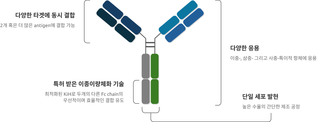 이 기술은 다중특이 항체의 뛰어난 생산성에 의해 다양한 구성으로 응용할 수 있습니다.